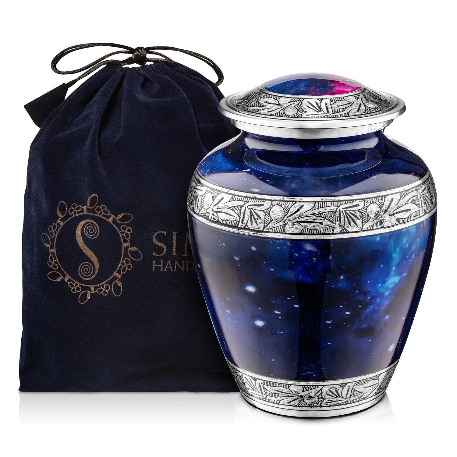 This hand painted blue fire cloud urn is unique in its own which is a true symbol of piece. The blue color and silver details ensure a polished and elegant finish.