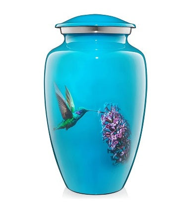 Hummingbird cremation Urn is the true hand painted and crafted product, which is perfect for any adult human ashes.This adult urn comes with top opening with a threaded lid and felted bottom.