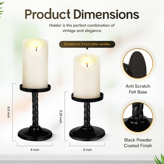 Our Black pillar candle holder set of 2 pieces, typically consist of two candle holders designed to hold pillar candles. These candle holders are made of metal (Iron) and they come in various designs and styles to suit different preferences and decor themes.
