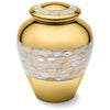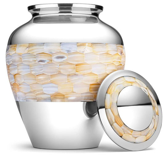 Product Details :- Mother of pearl cremation urn for adult human ashes are made of high quality brass material with silver electroplating technology making this urn very special for your loved ones ashes. Important Note:- Each Large silver Mother of Pearl Cremation Urn is hand made from solid high plated brass and mother of pearl. This urn has a top-opening with a secure threaded lid. Due to the nature of the natural stone, patterns and colors will vary with each memorial urn.